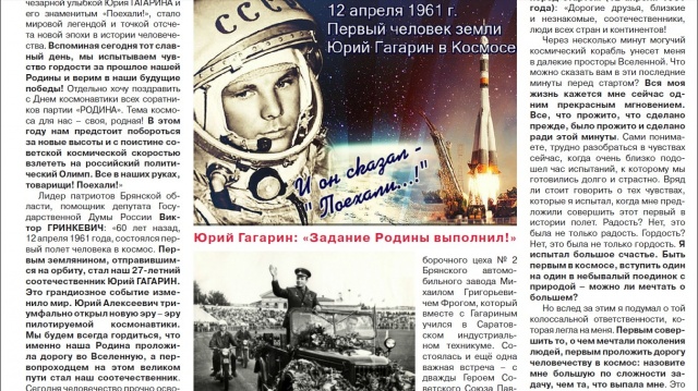 Лидер патриотов Брянской области, помощник депутата Государственной Думы России Виктор ГРИНКЕВИЧ: «Первым землянином, отправившимся на орбиту, стал наш 27-летний соотечественник Юрий ГАГАРИН. Это грандиозное событие изменило мир. Юрий Алексеевич триумфально открыл новую эру - эру пилотируемой космонавтики. Мы будем всегда гордиться, что именно наша Родина проложила дорогу во Вселенную, а первопроходцем на этом великом пути стал наш соотечественник. Сегодня человечество прочно освоило околоземную орбиту, создало крупнейшую станцию и готовится к покорению планет. Отечественная космонавтика выросла на кораблях «Восток», окрепла на «Союзах», а корабли «Орел» помогут освоить дорогу в дальний космос».