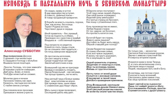 На четвертой полосе газета публикует Молитву ветерана брянской политики Александра Сергеевича СУББОТИНА «Исповедь в Пасхальную ночь в Свенском монастыре».