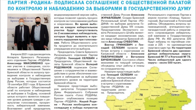На второй полосе публикуются материал о подписании Брянской «РОДИНОЙ» Соглашения с Общественной палатой Брянской области по контролю и наблюдению за выборами в Государственную Думу России.