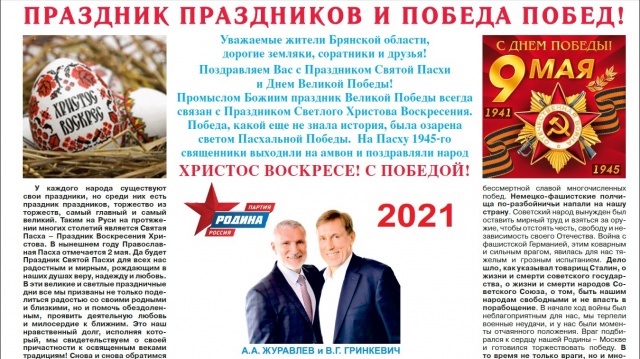 Накануне Праздника Православной Пасхи и Дня Победы 10-тысячным тиражом вышел апрельский выпуск газеты «Голос РОДИНЫ. Брянск» (электронная версия газеты: «Голос РОДИНЫ. Брянск»).