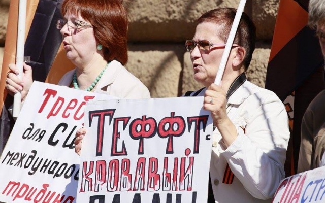 Лозунгами пикета были: "США – палач мира"; "США – страна двойных стандартов"; "Демократия США убивает"; "США – империя зла"; "Требуем для США международный трибунал"; "Теффт – кровавый палач"; "У США руки по локти в крови"; "Посольство США – штаб убийц России"; "США – террорист №1"; "США – мировой интервент", "Родина, свобода, Путин" и другие.