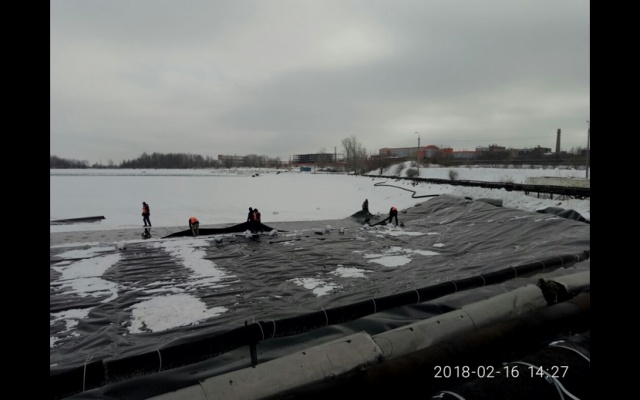 В данный момент пруды накрывают солнце-паронепроницаемой пленкой шириной 5,5 м. Мы посмотрели, как затем эту пленку склеивают между собой и укладывают на специальные поплавки, тем самым, шаг за шагом накрывая ей всю площадь пруда. Именно поэтому, все основные работы планируется завершить в максимально короткие сроки: пока водоемы остаются покрытыми льдом.
