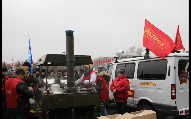 Патриоты Самарского регионального отделения партии развернули на площади большой парадный шатер, в котором угощали ветеранов и многочисленных гостей праздника обедом, приготовленным на полевой кухне "РОДИНЫ".