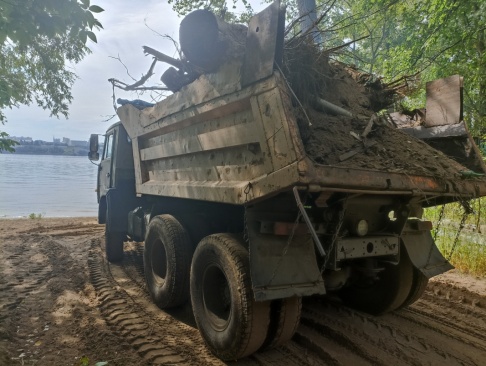 Помимо отходов древесины на месте складирования и фактического захоронения в лесной зоне осуществляется также отгрузка бетонных конструкций, автомобильных шин и других видов отходов. А общая территория вырубки ограждена навалами из спиленных деревьев и металлическими конструкциями, препятствующими свободному проходу по берегу реки Волги.